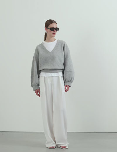 The Alani Sweat pairs a relaxed silhouette with refined proportions. Featuring a deep V-neckline and softly rounded sleeves, it offers a contemporary take on casual dressing. Perfect for layering or wearing as a statement on its own.
