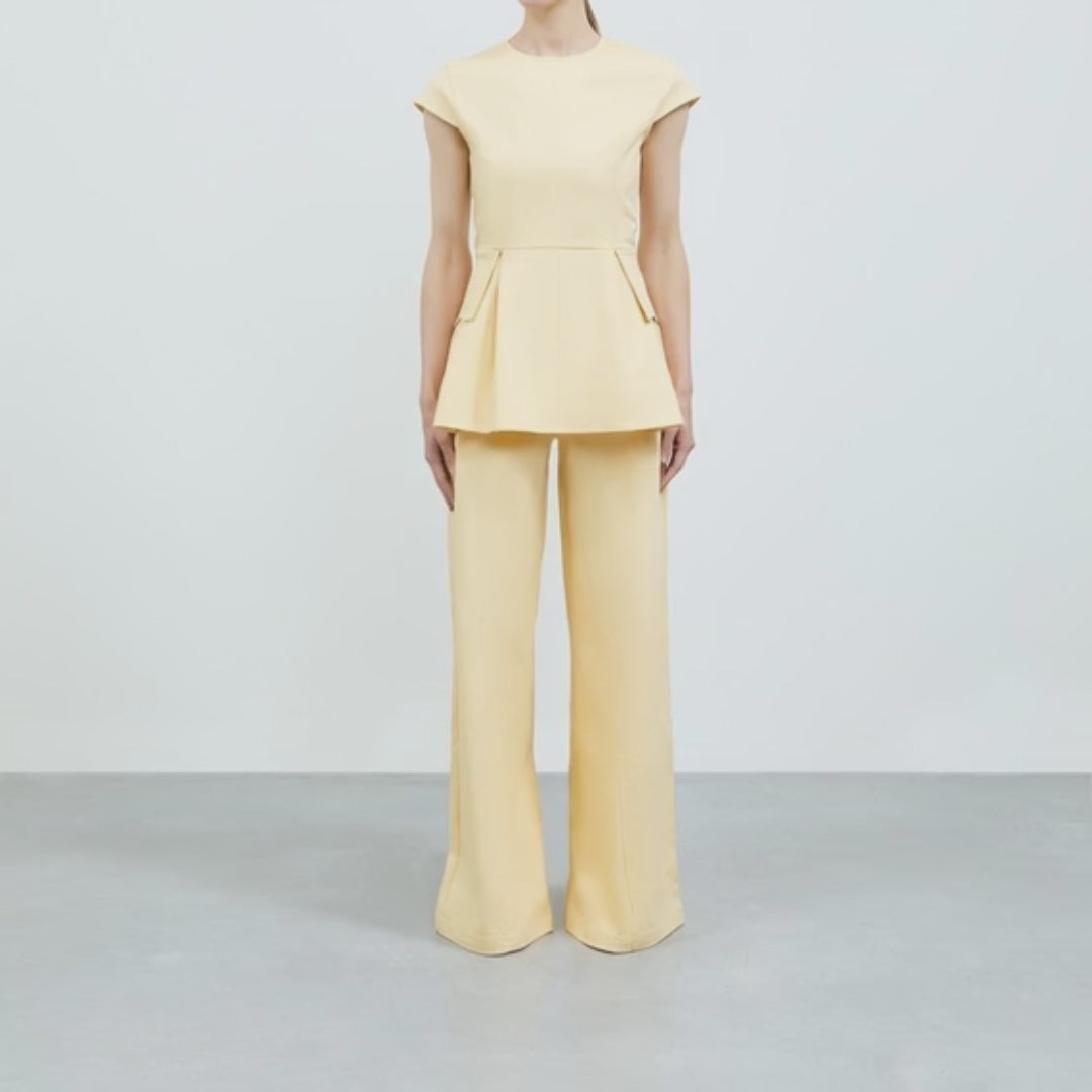 The Ida Top is defined by its structured bodice and flared peplum hem. With capped sleeves and precise seam detailing, it creates a sculptural silhouette that transitions seamlessly from day to evening.