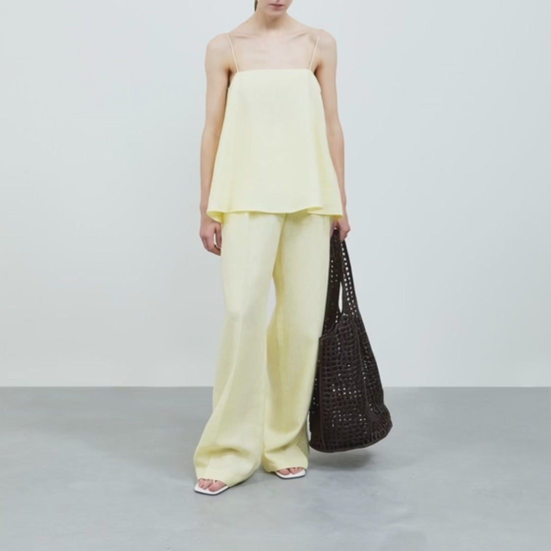 The Lou Top features a delicate, flowing silhouette with fine shoulder straps and a softly draped hem. Its minimal design evokes an effortless elegance, ideal for warm-weather dressing or layered sophistication.